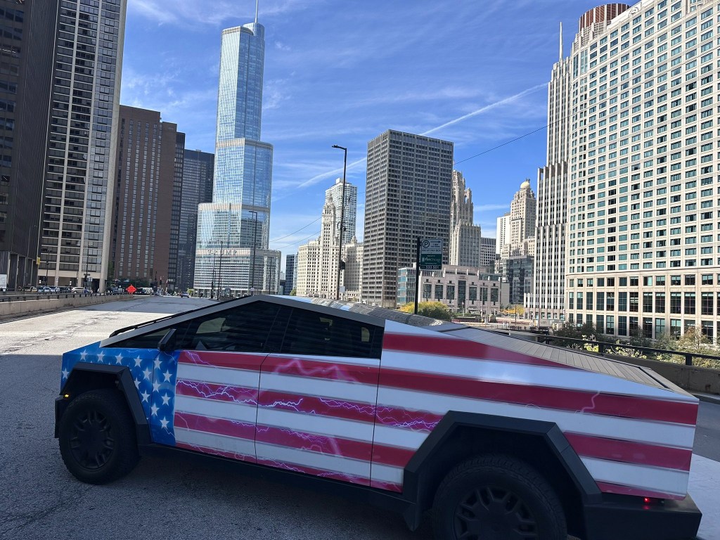 The Cybertruck, wrapped in an American flag design, was parked in Chicago’s Northalsted neighborhood while Evans attended a conference. @jeeotus / X