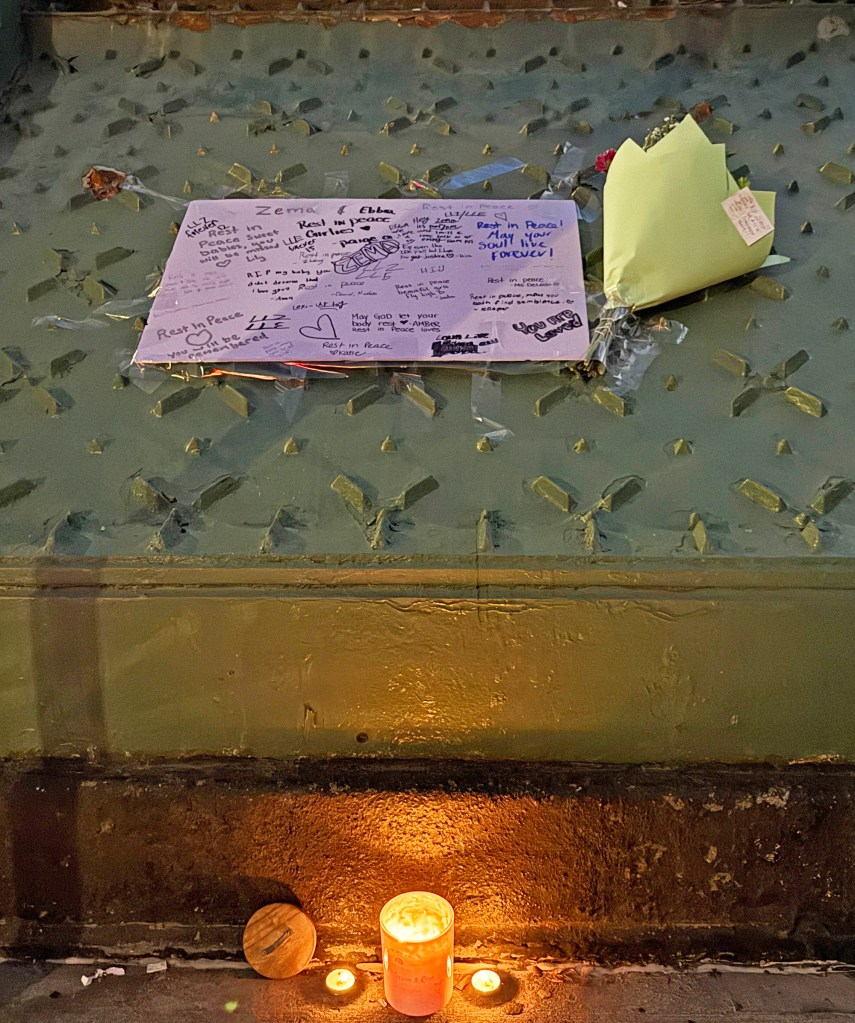 A vigil with a lit candle, a bouquet of flowers, and a handwritten note memorializing “Zema” and “Ebba.” Ella Morrison