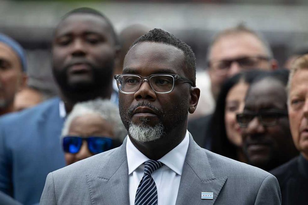 Chicago Mayor Brandon Johnson at a news conference to address President Donald Trump’s plan to send National Guard troops into the city on August 25, 2025, in Chicago, Illinois. Photo by Scott Olson/Getty Images.