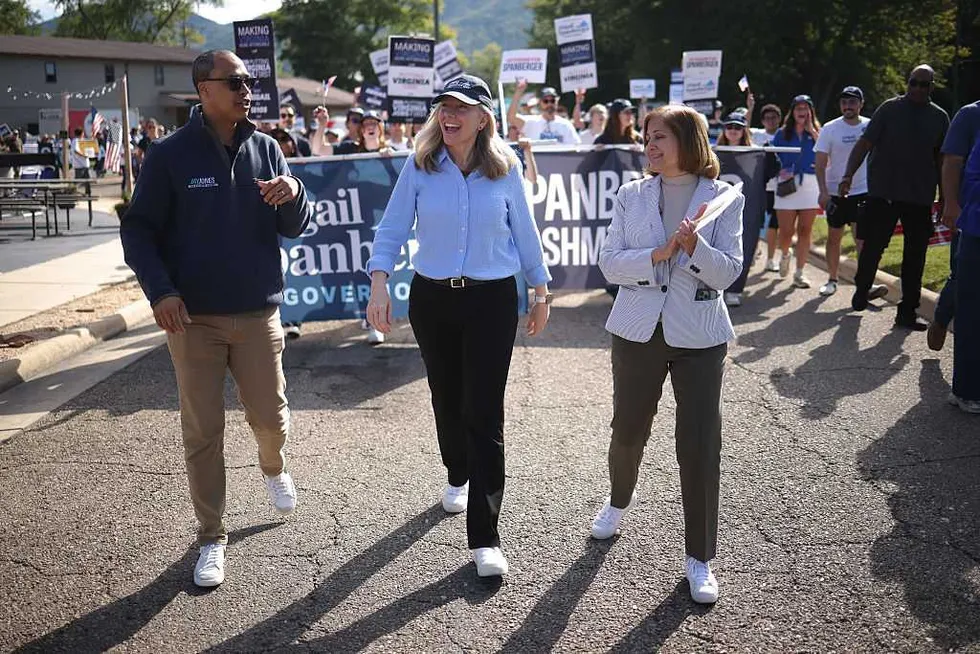 Democratic Nominee for attorney general Jay Jones, Virginia Democratic gubernatorial candidate Abigail Spanberger, and Democratic nominee for lieutenant governor Ghazala Hashmi. Photo by Win McNamee/Getty Images
