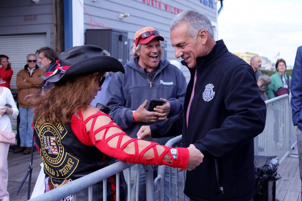 Ciattarelli shakes hands with a woman wearing a “Born to Ride for Donald J Trump” vest during a rally Friday on the Wildwood boardwalk. Leonardo Munoz