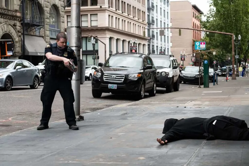 A man is arrested after a shootout with anti-fascist activists on August 22, 2021, in Portland, Oregon. (Photo by Mathieu Lewis-Rolland / AFP) (Photo by MATHIEU LEWIS-ROLLAND/AFP via Getty Images)