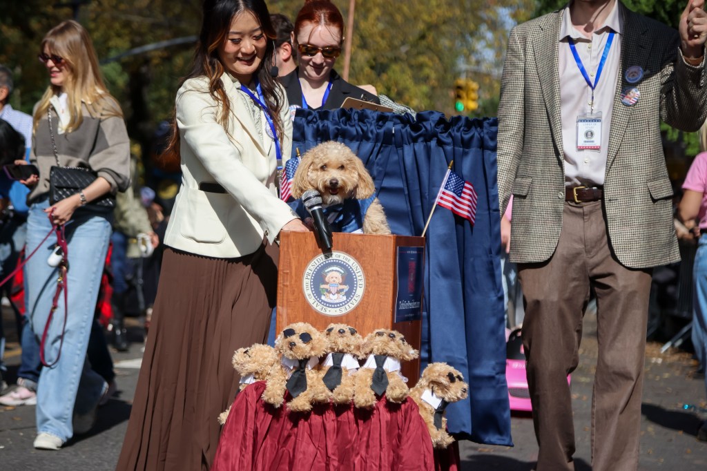 The parade’s canine costume competition – featuring 300 photo-ready entrants – was whittled down to 20 finalists following the march, with competitors ranging from French bulldog Halvor sporting an “Audrey II” costume from “Little Shop of Horrors” to Yorkipoo Puccini wearing matching Nutcracker costumes with former Radio City Rockette Leslie Riddle.