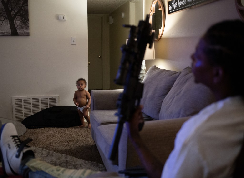 The kid cooking with pistols in his waistband, that’s innocence colliding with survival, childhood and adulthood caught in the same frame. And those extended magazines sticking out. To me they looked absurd, like Lego blocks or power tools at first glance. That strangeness is what makes the image potent, so surreal it becomes ordinary.
