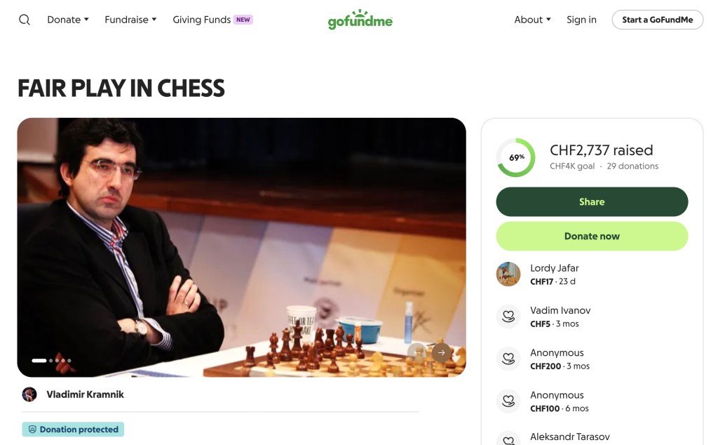 Kramnik later deleted his account on the website chess.com after launching a GoFundMe to crowdfund his unspecified goal of “trying to clean modern chess from cheating.”