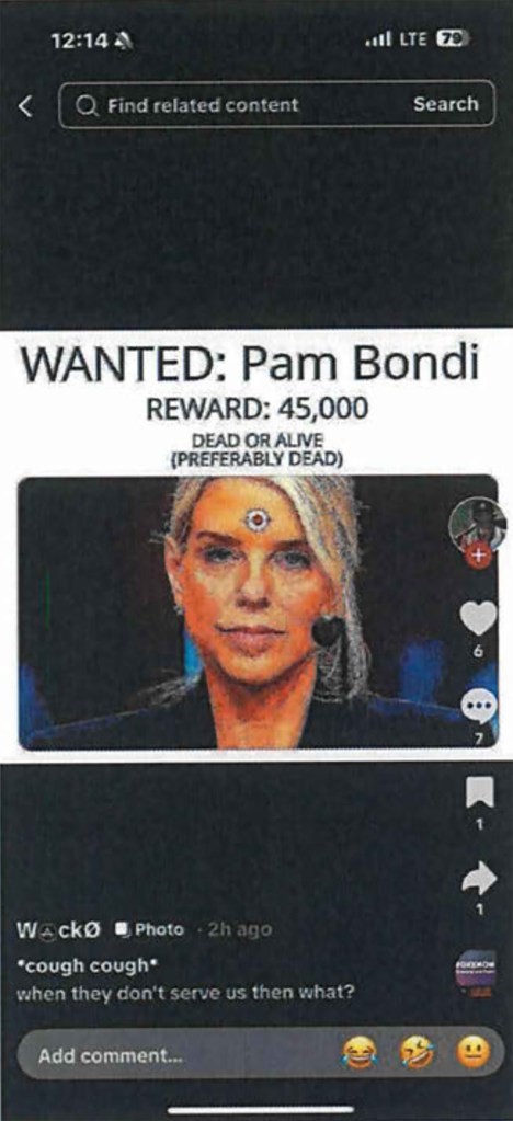 The chilling post included a photo of Bondi with a “sniper-scope red dot” on her forehead with the caption: “WANTED: Pam Bondi / REWARD: 45,000 ‘ DEAD OR ALIVE / (PREFERABLY DEAD),” court documents charge.