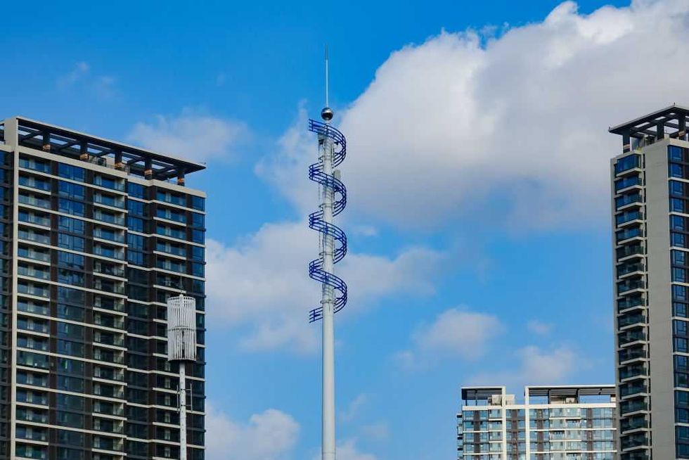 A cell tower for 5G network among buildings is pictured on January 1, 2021 in Qingdao, Shandong Province of China. Photo by VCG/VCG via Getty Images