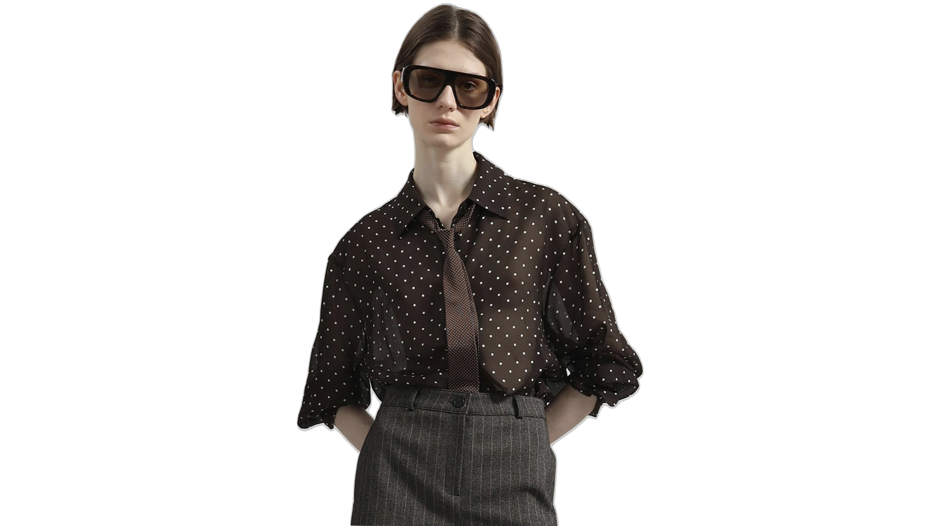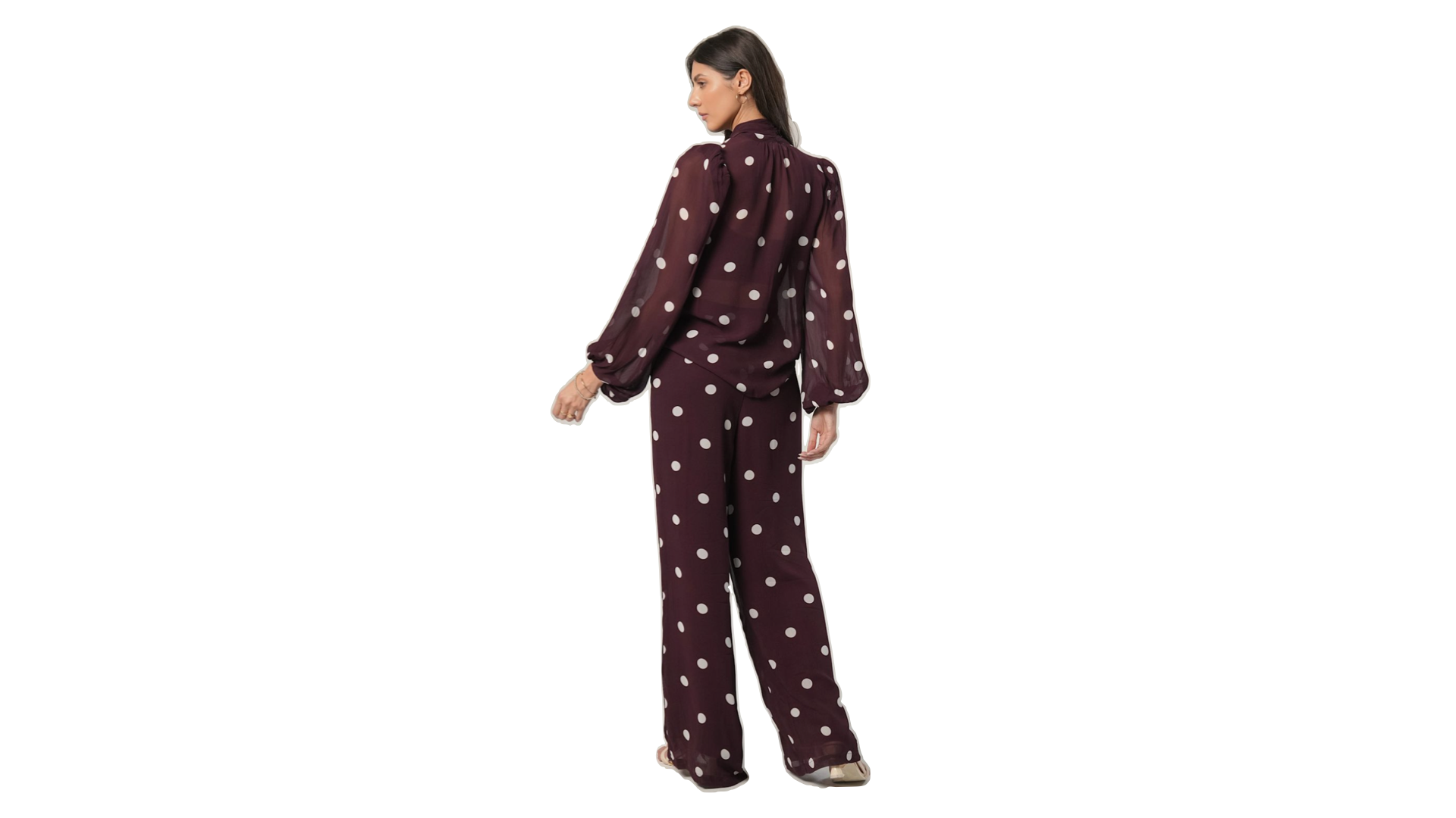 Saphi Chocolate Wine Polka Dot Wide Leg TrouserNot every polka dot piece needs to come in a trendy silhouette. These trousers by Saphi, for example, bring the print in a fun chocolate-white colorway to a classic cut of bottoms. Style these with everything from a bra-and-blazer combo to a going-out top for an elevated night out.
