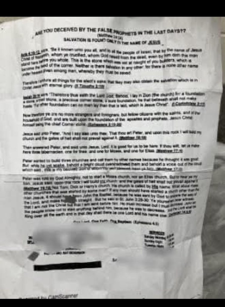 The letter appeared to contain a typed religious message, according to photos released by police.