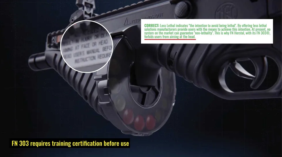 Targeting the head with kinetic-impact projectiles is prohibited by manufacturers and industry safety standards due to the risk of fatal injuries. It is considered lethal force. The website of FN Herstal, parent company of FN America, stresses the point, saying the company “forbids users from aiming at the head.”