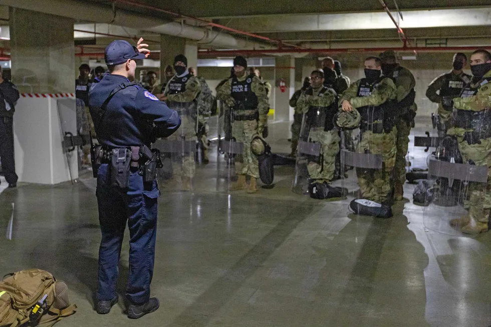 U.S. Capitol Police Officer Shauni Kerkhoff shows a rubber bullet to soldiers of the Maryland Army National Guard’s 115th Military Police Battalion, Salisbury, Md., during a joint training event in Washington, D.C., on Jan. 27, 2021.U.S. Army National Guard photo by Sgt. Arcadia Hammack