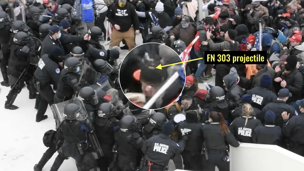 A crowd-control projectile fired by U.S. Capitol Police strikes a protester in the head on the U.S. Capitol West Plaza at 1:06 p.m. on Jan. 6, 2021.U.S. Capitol Police