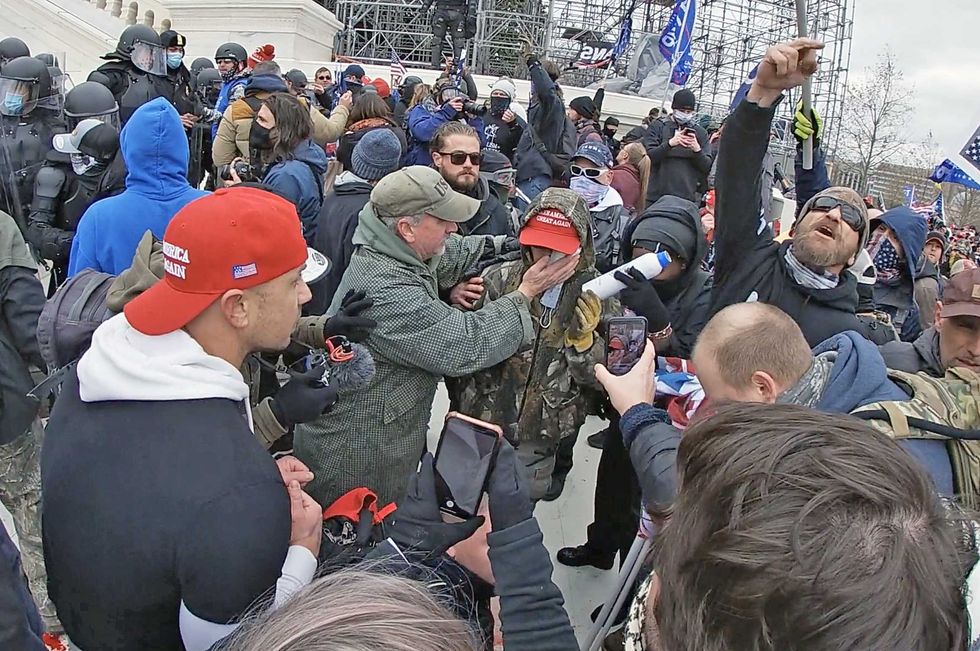 While Black was getting attention for his wound, a pepper ball fired from above struck a Capitol Police CDU officer in the back of the helmet, sending a cloud of pepper powder into the air. A second shot narrowly missed another officer’s head and exploded on the officer’s riot shield, video showed.