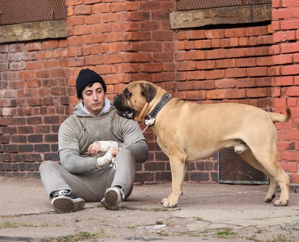 Anthony Ippolito sits with a dog while filming at the “I Play Rocky” set in New Jersey. GC Images