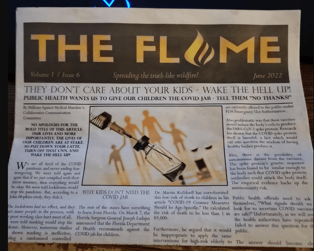 Early in 2022, folks across Washington state noticed an unfamiliar free paper appearing in news racks at local shops and restaurants. In a few areas, unsolicited copies even arrived in the mail or on doorsteps. At a glance, The Flame looked a bit grungy but ultimately unremarkable. However, readers who bothered to skim the issue soon realized it was chock-a-block with COVID trutherism—wild, baseless tirades alleging medical tyranny and threats to liberty. This was no one-off stunt. Month after month, new issues turned up, pushing an ever-wider array of conspiracy theories—climate change isn’t causing wildfires, but maybe energy superweapons are! Public schools are trying to turn your kids trans!—to more and more neighborhoods.