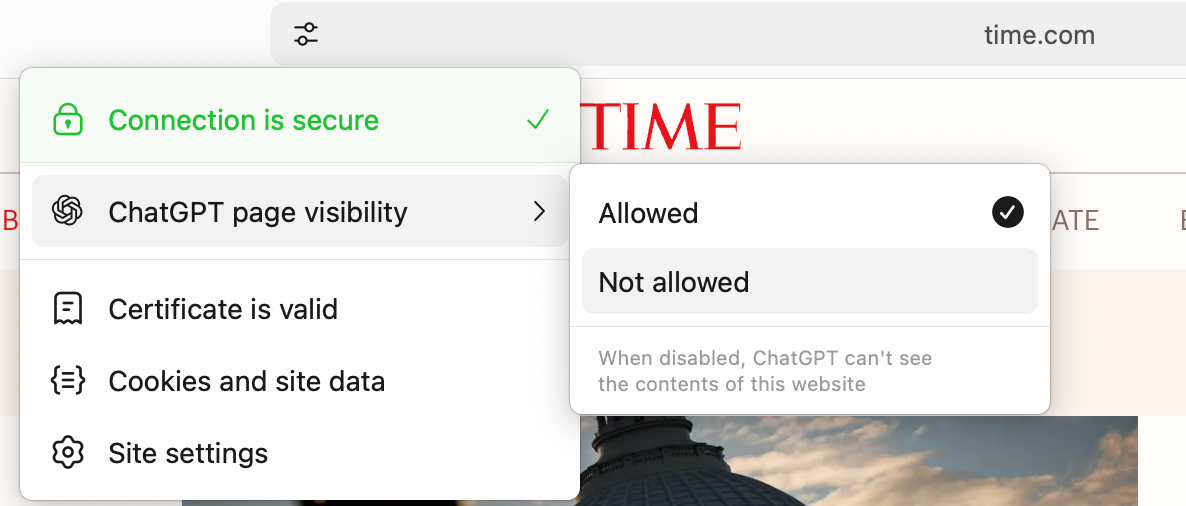 However, users aren’t privy to exactly which parts of the website the AI is retrieving, or how it decides what it needs. To err on the side of caution, Atlas lets you remove pages from the chat window (look for the “x” when you hover over the website name in the chatbox) or block certain websites from being passed to ChatGPT altogether through the settings in the URL bar.
