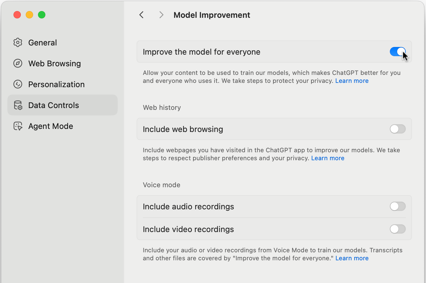 The safest option is to disable “improve the model for everyone” altogether, which OpenAI says will prevent it from training on your chats or your web browsing data.