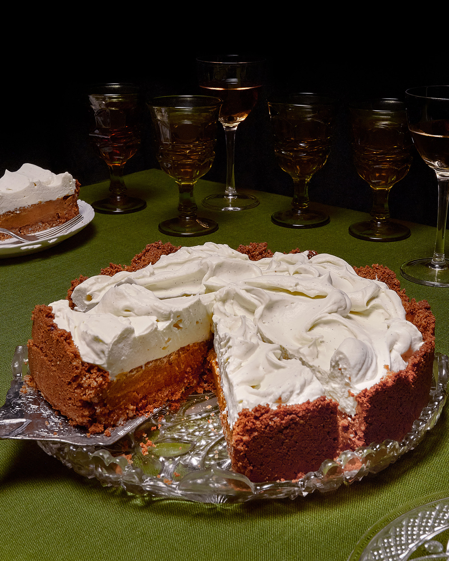 For the pumpkin pie, I wanted a crust that tasted good when cold, given we’d make this well before the feast and keep it chilled in the fridge. Graham cracker was the obvious choice, and ground pecans add texture and flavor. Crucially, I wanted to bridge the gap between those who love pumpkin pie and those who love the flavor but not the “wet” texture it sometimes has. This version is dense but creamy and packed with warm spices bloomed by brown butter, which my longtime readers know I tend to put in the most unexpected parts of a dessert. The pie is baked in a springform pan with an easy press-in crust and topped with a thick and tangy cream cheese whipped cream. Get the recipe.