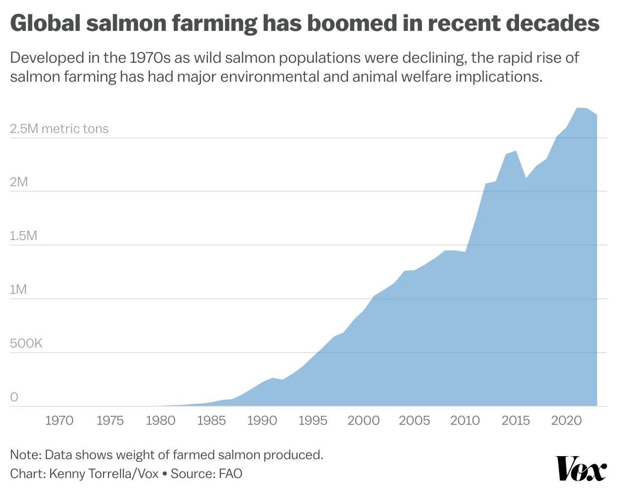 To take pressure off depleted wild populations, seafood producers began to scale salmon farming in the 1970s, with ample help from governments in the form of R&D, grants, state financing programs, and more. It’s proven to be a smashing commercial success.