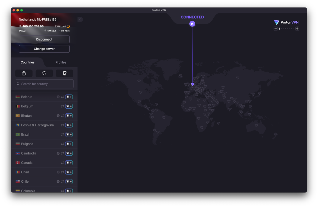 Using the free version of Proton VPN, you don’t get to choose which server you connect to, or even which country. You have just one choice, whichever is the fastest at the moment. Upgrade to Proton VPN Plus and you can select from 11,802 Proton VPN servers (in “110+ countries”), of which 8,732 are for Plus users only.
