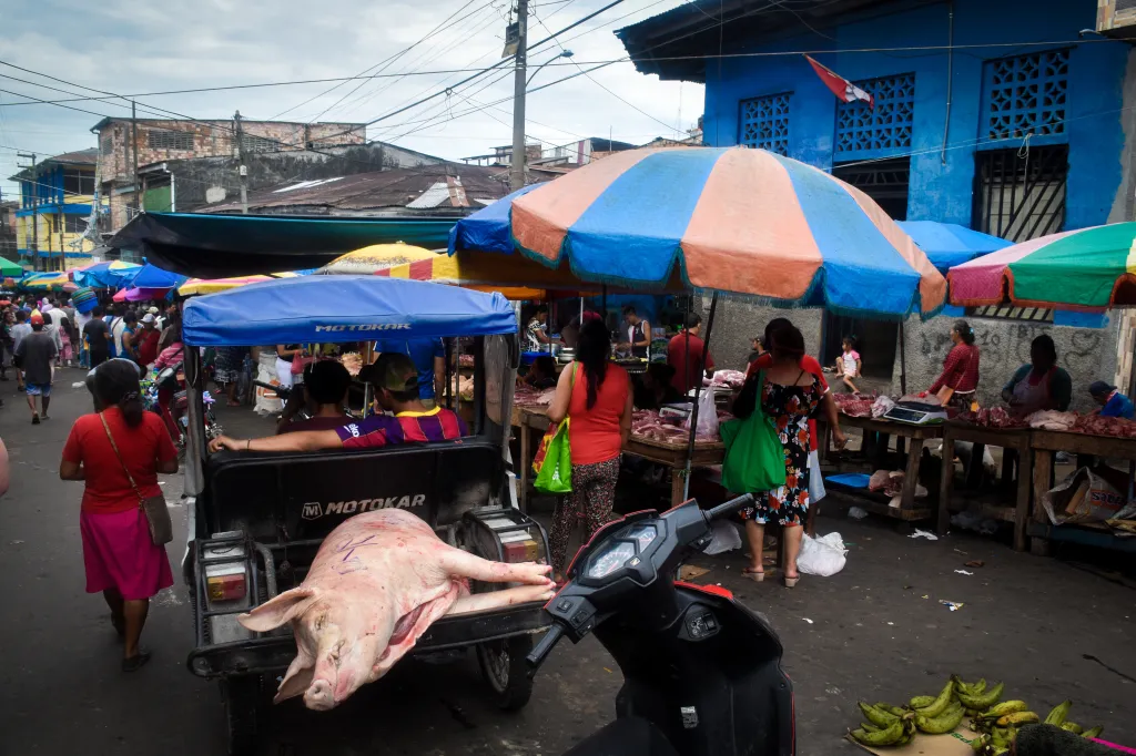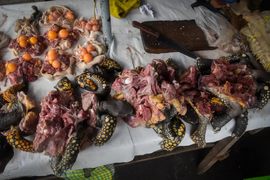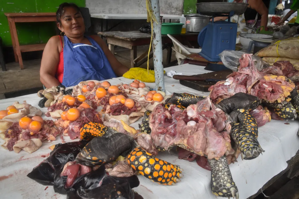Belén market sells just about anything. Bottled ayahuasca. Shish kabobs made from grilled larvae. Skinned howler monkeys. Yellow-footed tortoises, gutted alive and sold to women with the promise that the meat tames jealous men. The skin of a jaguar, steaks made from sliced caiman, and giant containers packed with turtle eggs—all of which are sold alongside more mundane items, like flour, sugar, and rice. Belén, in other words, is a one-stop shop for the Amazonian town of Iquitos’ local residents. It’s also a powder keg for disease.