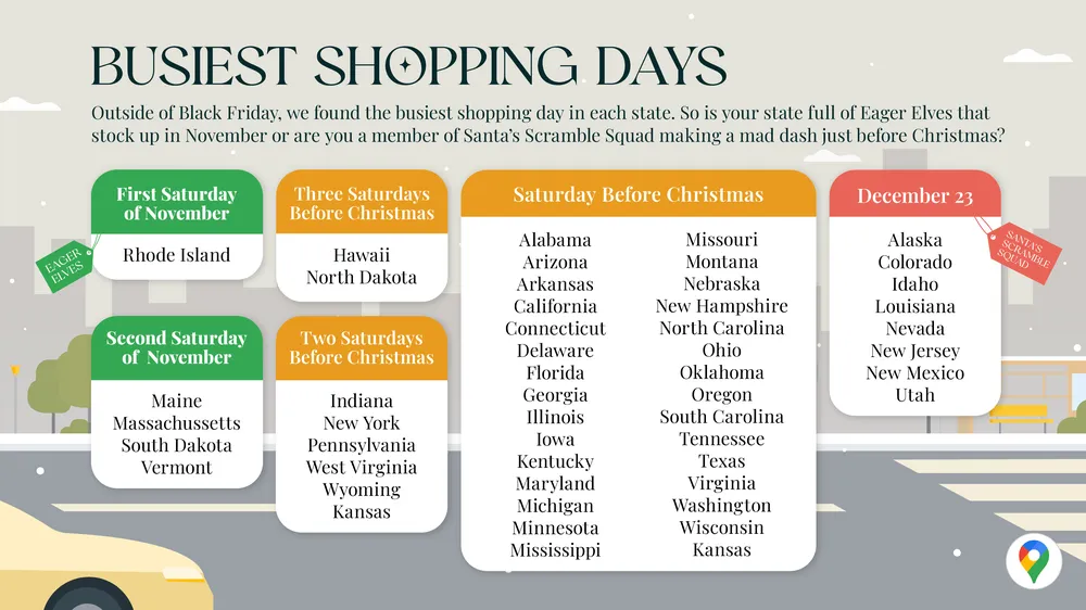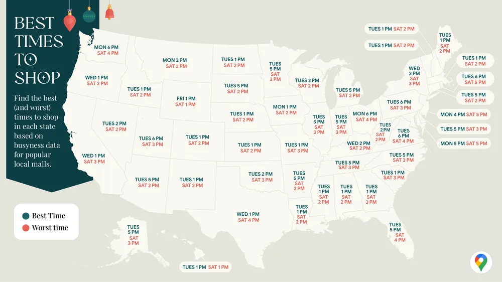 Using the data gleaned from Google Maps, Google ginned up a few ideas on when you should shop if you want to avoid the crowds in November and December. Take a look, and see where your state ranks.