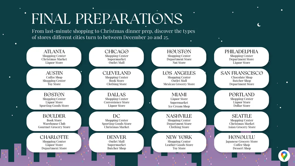 For those procrastinators, Google found most people head to shopping malls regardless of what state they live in, but there are a few interesting surprises. San Franciscans head to chocolate stores when they need to buy somebody a last-minute gift. Houstonites have in their top three “nut store.” Denver has the butcher shop.