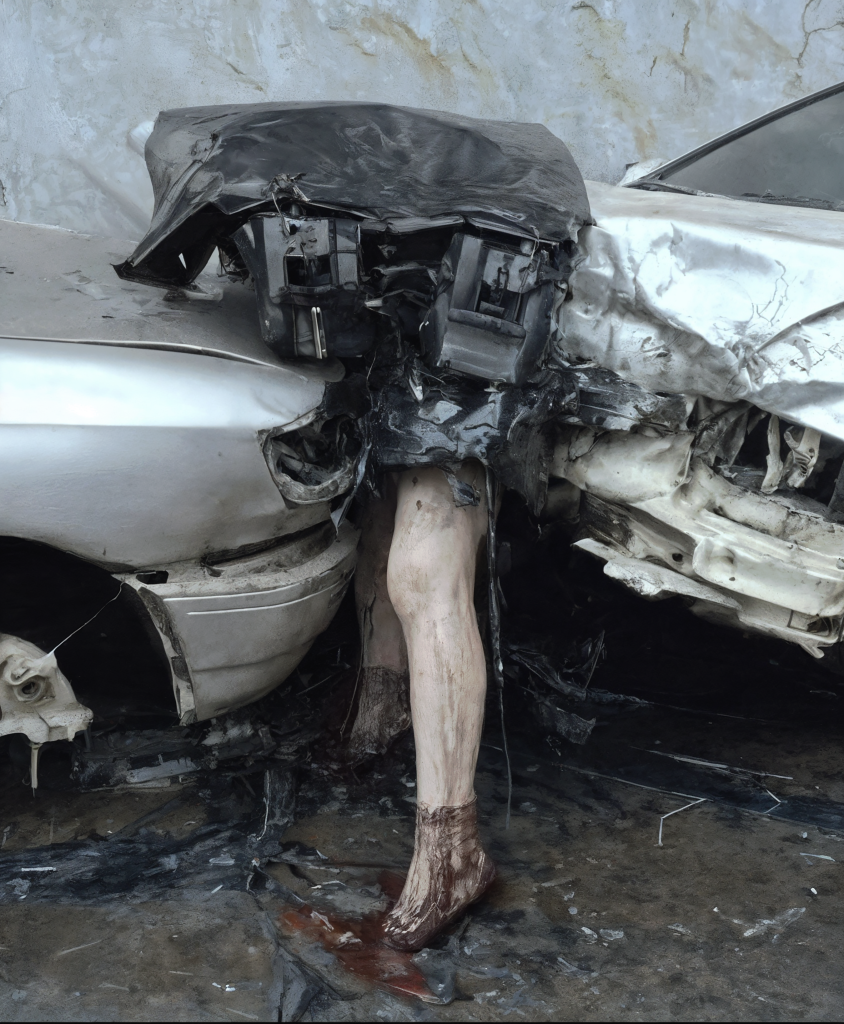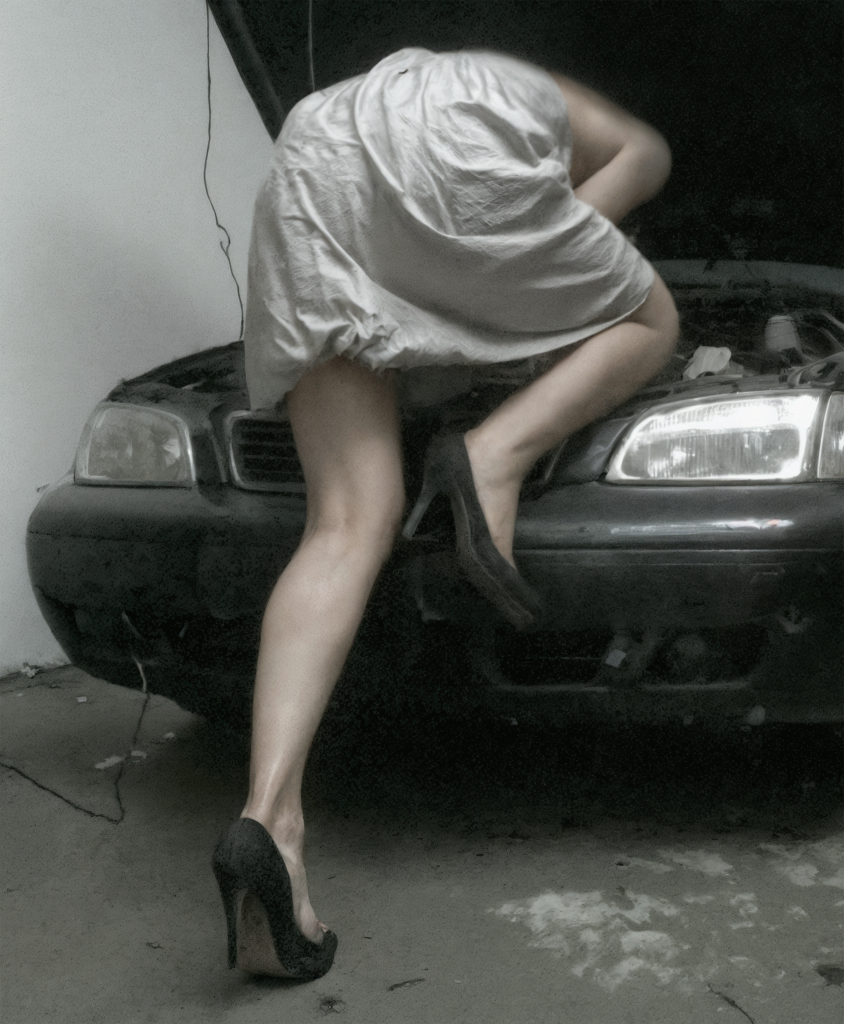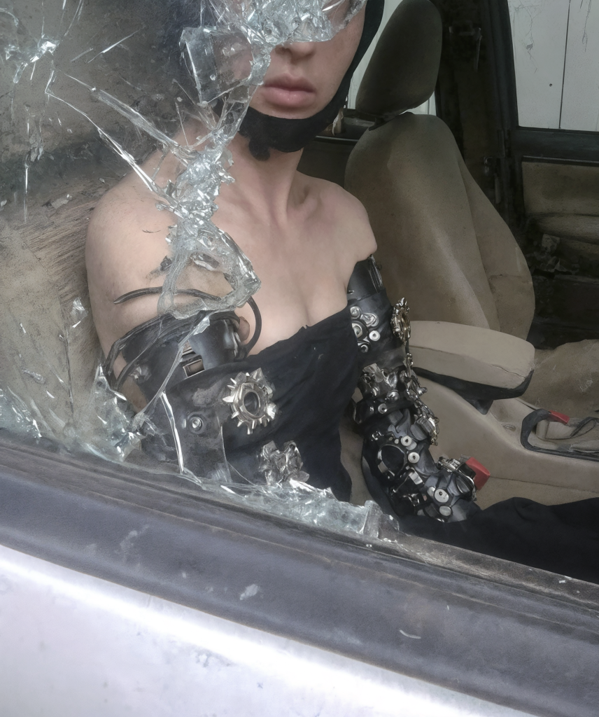 Soon however, the novelty wears off, and it’s not long before she starts looking for the next enhancement—and the next and the next. She starts taking small, unnoticeable pieces from his car, the epitome of feminine beauty, and surgically merging them with her own body. Until one day, while he is on tour, she decides to take the entire underside of the car and rebuild it inside herself, before taking the final step and amputating her hands and feet, replacing them with his wheels—her wheels.