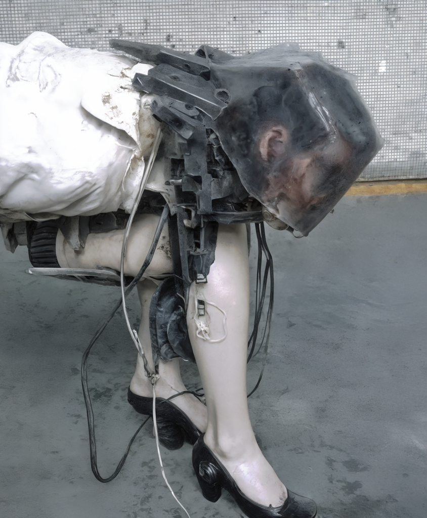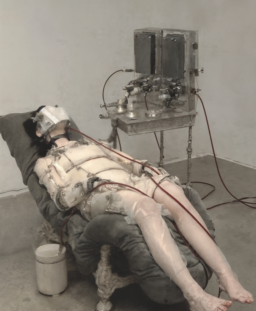 Without nerves, acting with pure unwavering intent, she begins to operate on herself, integrating the pieces of mechanics into flesh. On her left leg, she constructs what could almost be mistaken for an Ilizarov frame.