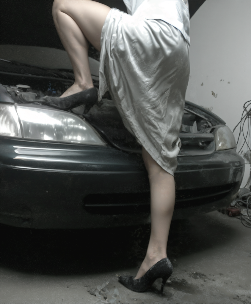 She decides to devote her annual allocated work holiday to exploring this and drives to a posh suburb of LA one evening to begin her stake out. It takes a day and a half of burning anticipation in her car before she spots him from a distance, parking his car and entering one of the large houses. Heart pounding, she runs to his car, the night disguising her for the most part. She reaches the vehicle and can no longer contain herself. She licks and wraps herself around the car like a rabid thing. Sucking on the wing mirrors and writhing over the windshield. She slides beneath the car and wedges a heel inside the mechanics to try and get closer, to get inside, entwining a leg through the steel suspension. Lifting her body up against the undercarriage, she grinds until she orgasms.