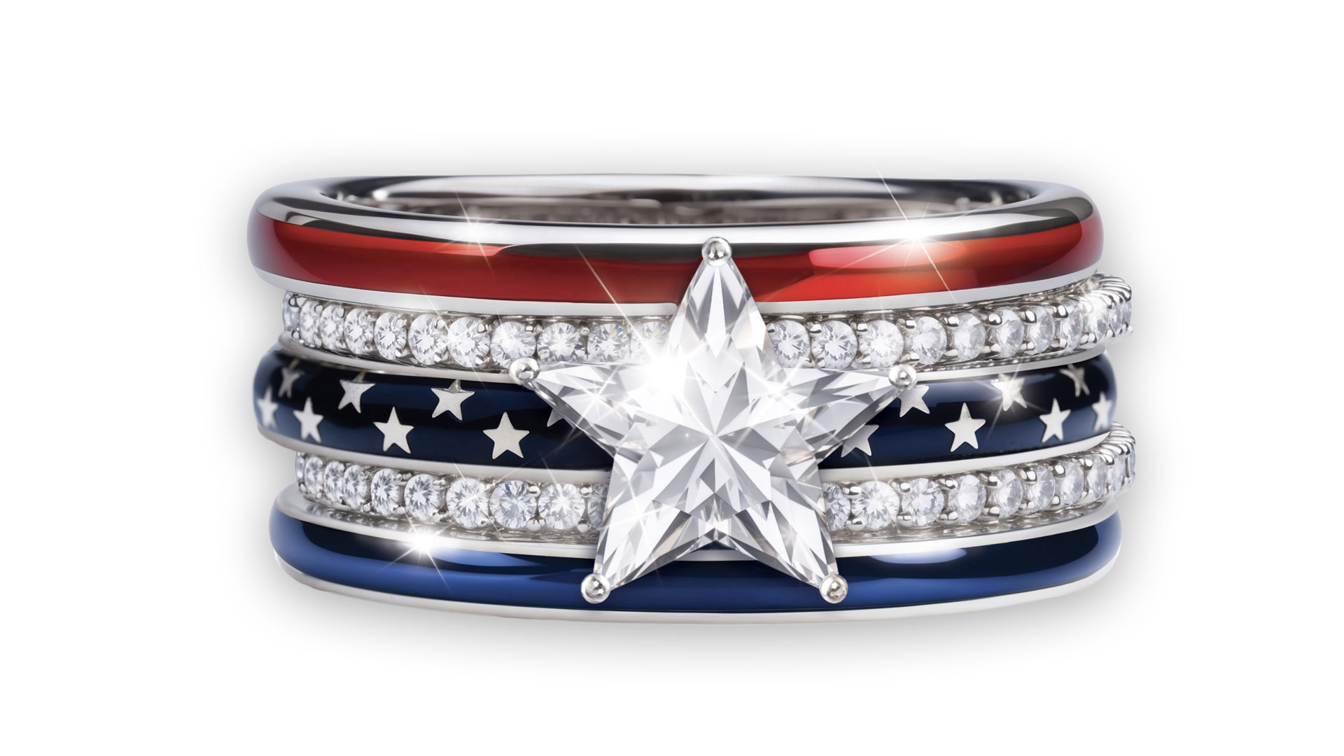 The beauty and spirit of Old Glory is captured elegantly in this five-band ring. A two-carat, star-cut simulated diamond is set in the middle of a field of white stars. The ring is also engraved with patriotic sayings like “Spirit of 1776,” “Stars & Stripes Forever,” and “Honoring 250 Years.”