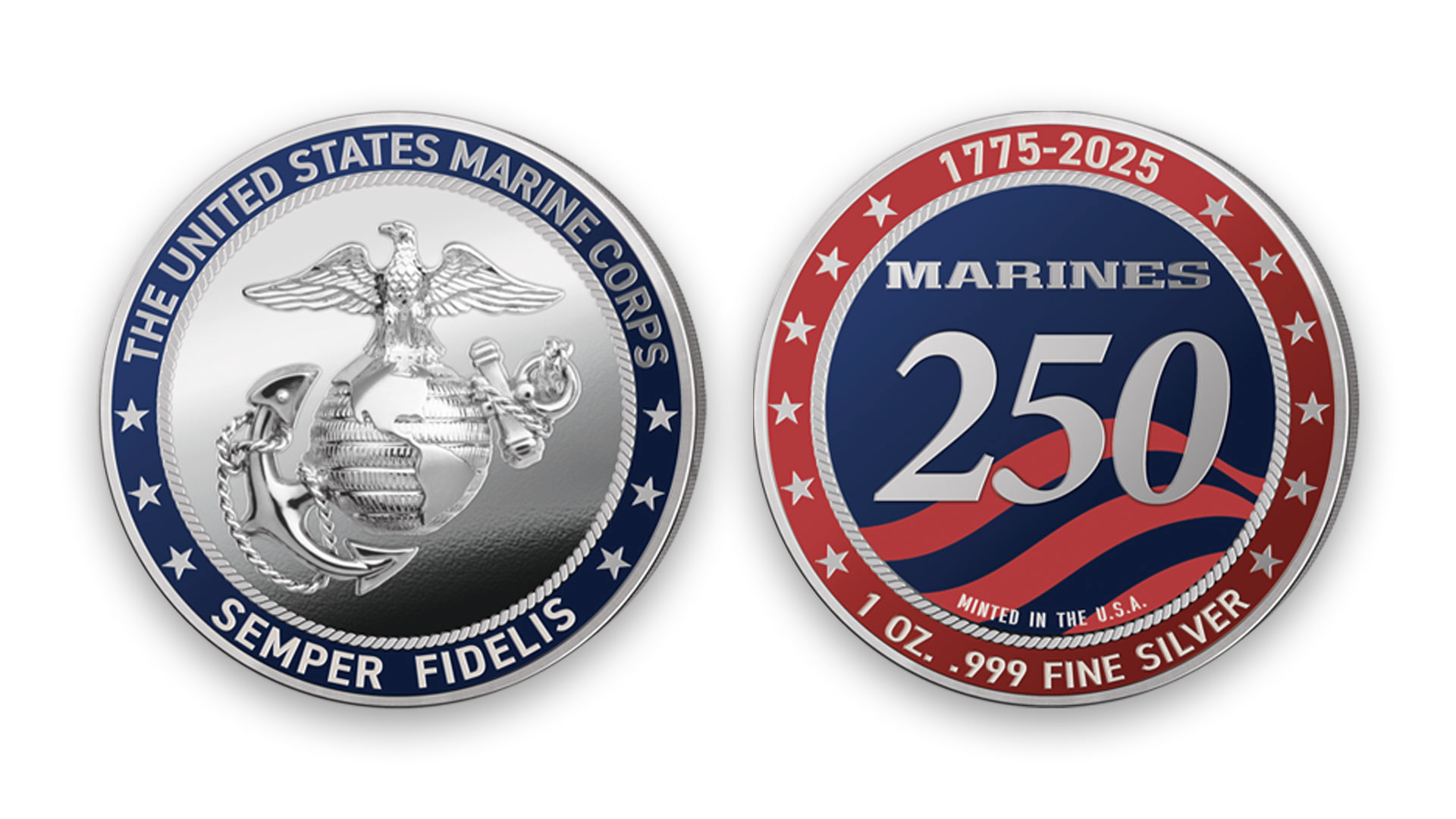 Proudly minted in the United States, this 99.9% pure silver coin celebrates the 250th anniversary of the United States Marine Corps. The front of the coin features red and blue hand-enameled details, while the back displays the Marine Corps logo and motto “SEMPER FIDELIS.” It also comes with a deluxe display stand at no extra charge.