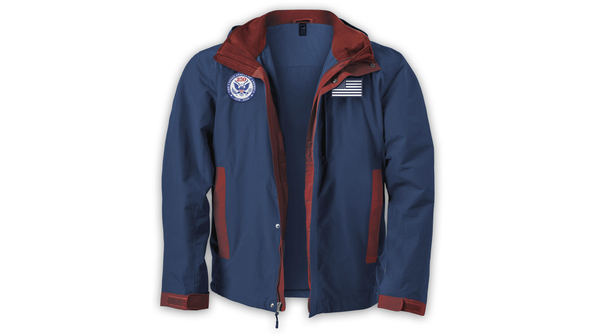 With a lightweight rain shell and a fleece that can be worn together or separately, this three-in-one jacket is the definition of versatility. On the right side of the jacket is a patch featuring the Great Seal of the United States— in honor of the nation’s 250th birthday— and an American flag patch on the left.