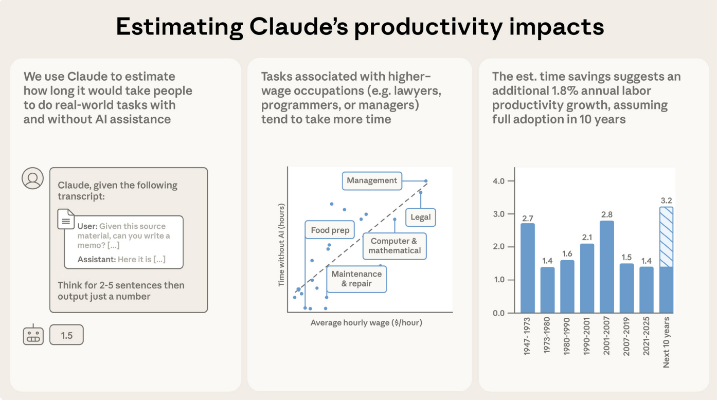 How the study works — But take these numbers with a large pinch of salt, because the method that yielded them is unorthodox. First, Anthropic researchers built a tool (called Clio) that allows them to extract details about real-world Claude usage in what they say is a privacy-preserving way. Armed with a sample of 100,000 conversations, the researchers analyzed them to check what kinds of tasks Claude was performing in each. To quantify how much time Claude saved in each conversation, they asked a separate version of Claude to estimate how long each task would take with and without AI assistance. Then, they consulted existing economic data to calculate the average wage value of that saved time, depending on the profession involved. Finally, they extrapolated those time savings, weighted by each task’s importance to the entire economy, thus arriving at a number showing the efficiency gains contributed by AI across different task profiles.