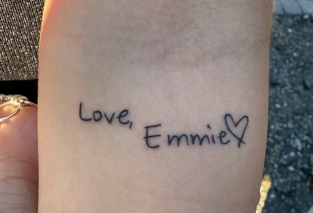 Ballan also carries a second tattoo on her right arm: “Love, Emmie,” copied exactly from Finn’s handwriting on an old card.