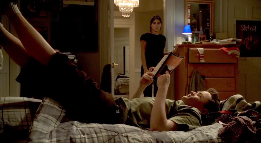 Tony officially takes over as head of the DiMeo crime family. Meanwhile, what’s his male heir doing? Joyriding in his parents’ car, hanging out at the mall, smoking weed in the garage, and experimenting with nihilism. As Chino Moreno himself sang: big mood. Exactly what a Deftones fan would be into. But where is the merch, bro? In this season, Limp Bizkit’s Significant Other artwork features prominently on the wall next to AJ’s window while a toy snake dangles opposite… could this be a private music precursor? Absolutely not.