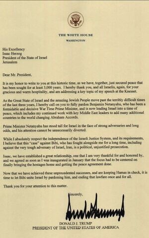 Because Netanyahu faces Israeli, not U.S., charges, he had to seek relief from Israel’s president, Isaac Herzog, rather than from Donald Trump. But Trump has already weighed in. In a letter last month, he urged Herzog to issue a pardon. The case against Netanyahu is “political, unjustified prosecution,” Trump wrote, concluding with his standard line to an implied underling: “Thank you for your attention to this matter.”