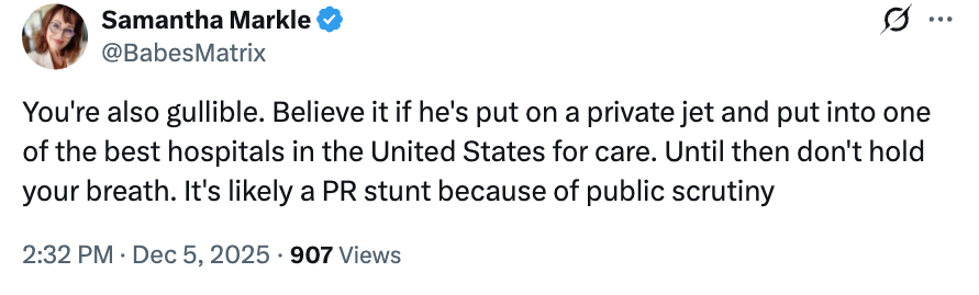 “You’re also gullible,” Samantha, 61, wrote. “Believe it if he’s put on a private jet and put into one of the best hospitals in the United States for care. Until then don’t hold your breath. It’s likely a PR stunt because of public scrutiny.”