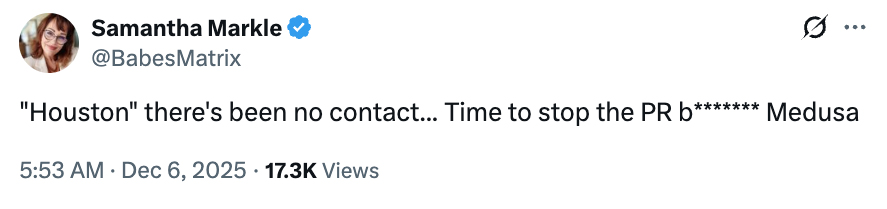 In another tweet, the older sister of the As Ever founder wrote, “Houston there’s been no contact… Time to stop the PR b******* Medusa.”