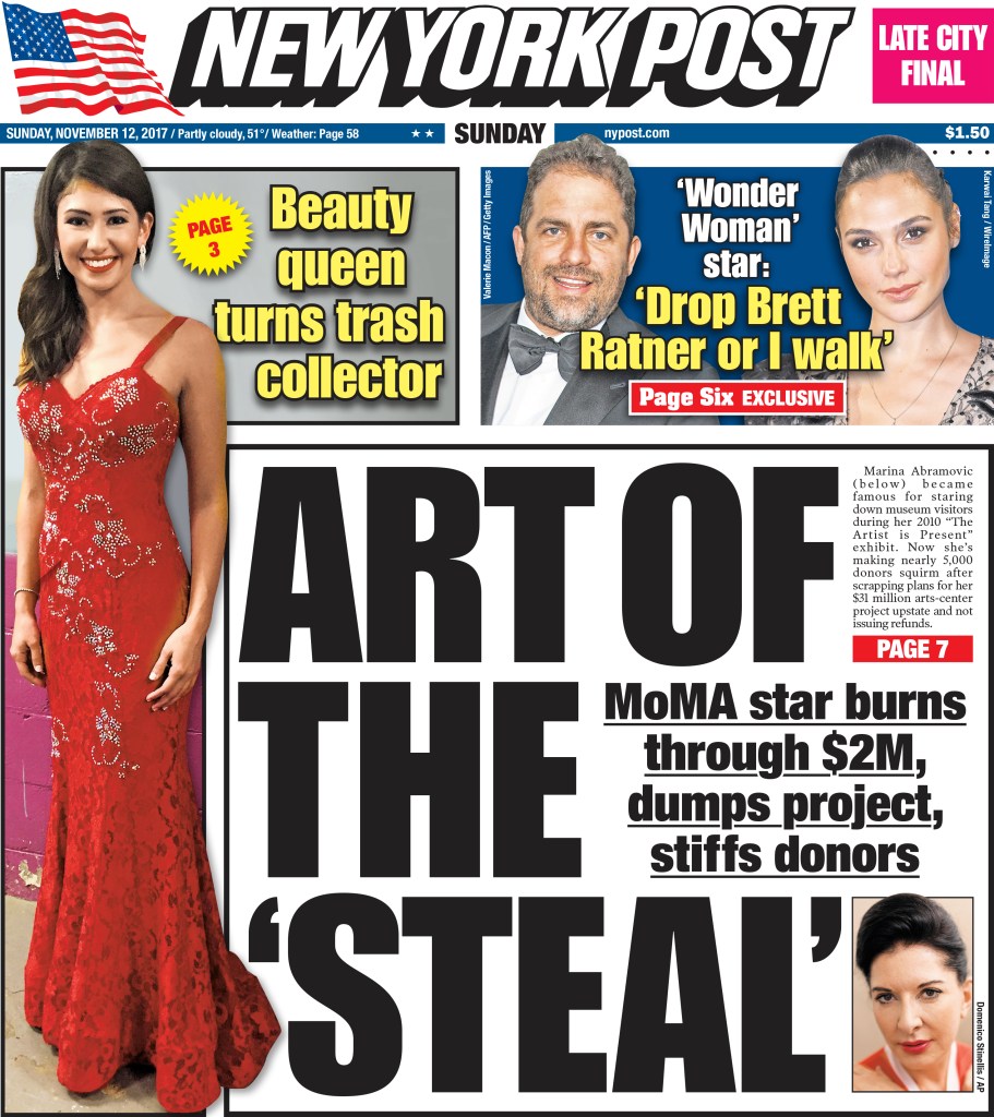 In 2017, The Post ran an expose called “the art of the steal,” after the edgy artist backed out of her plans to turn an upstate building into an art center, amid questions of where the $2.2 million in donations she’d collected went. Abramović never faced legal action for the missing money.