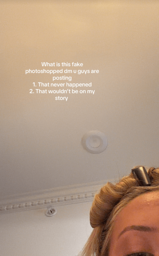 But on Sunday, she took to TikTok and wrote, “What is this fake photoshopped DM u guys are posting. 1. That never happened. 2. That wouldn’t be on my story.”