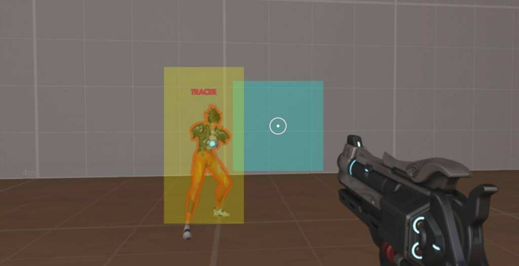 In Overwatch 2, aim assist helps correct a player’s aim within their ‘aim window’, as seen in blue in the screenshot above, to the ‘character window’, as seen in yellow above. This area is referred to as the ‘aim assist bubble’ and can be dialed up to strengthen the aim assist effects, depending on your personal preferences.