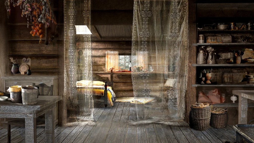 Because Veloso worked largely with natural light, Schaller placed windows strategically. During night shoots, the interior was filled with lanterns and candles chosen by set decorator Melisa Jusufi, who “excavated Washington State for period-appropriate items” like pitchers, baskets and stoneware to populate shelves and tabletops. All props had a use — like hand-carved wooden candle holders and the mobile above Katie’s bed.