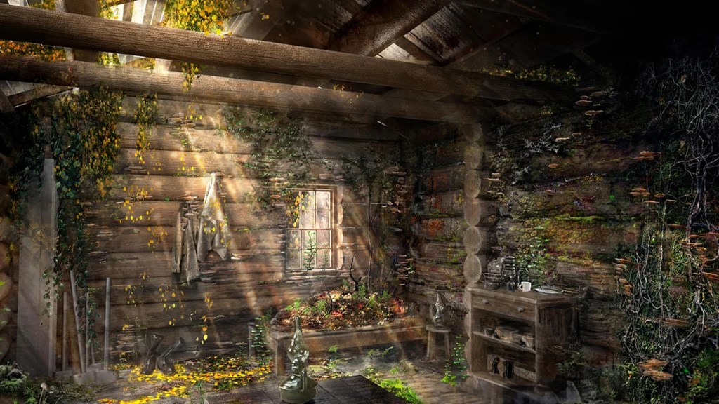 For the new dwelling, Schaller’s team covered up the space that served as the sleeping area in cabin No. 1 and used minimal furnishings to create the stark environment of a grieving single man. As Robert ages, flora sprouts between the floorboards and walls, eventually overwhelming the space by the time Robert takes his last breath. The flowers were, of course, yellow. “His physical body has returned to the land,” Schaller said. “But his soul is being returned to his family.”
