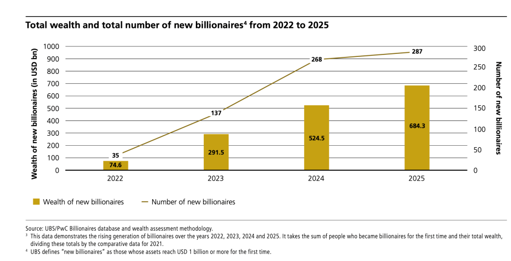 That year, 360 self-made billionaires accounted for $782 billion, an “exceptional rise [that] resulted from asset price appreciation in a period of ample financial liquidity following the COVID-19 pandemic.” The result in 2025 was more down to “widespread business creation,” UBS added. The report found the number of new billionaires minted annually increased roughly eightfold from 35 in 2022 to 287 in 2025, while their assets have grown by roughly ninefold, from $74.6 billion to $684.3 billion.