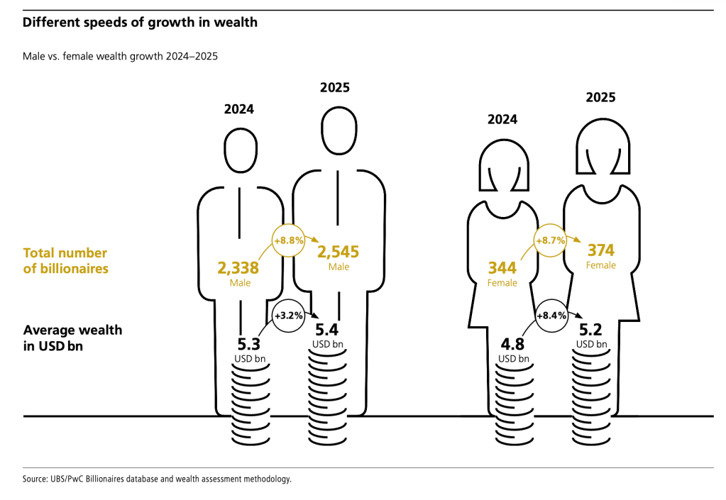 Female billionaires made notable progress in 2025, according to the report. While there are only 374 female billionaires globally, compared with 2,545 male, their average wealth grew by 8.4% to $5.2 billion in 2025, more than twice the 3.2% average growth rate for men. This is part of a trend, with the average wealth of female billionaires rising at a faster rate for each of the four years since 2022. In part, this is driven by inheritance, with more women becoming billionaires through inheritance than any other way in 2025. Of the 43 women who became billionaires in the year, UBS found that 27 inherited while 16 were self-made.