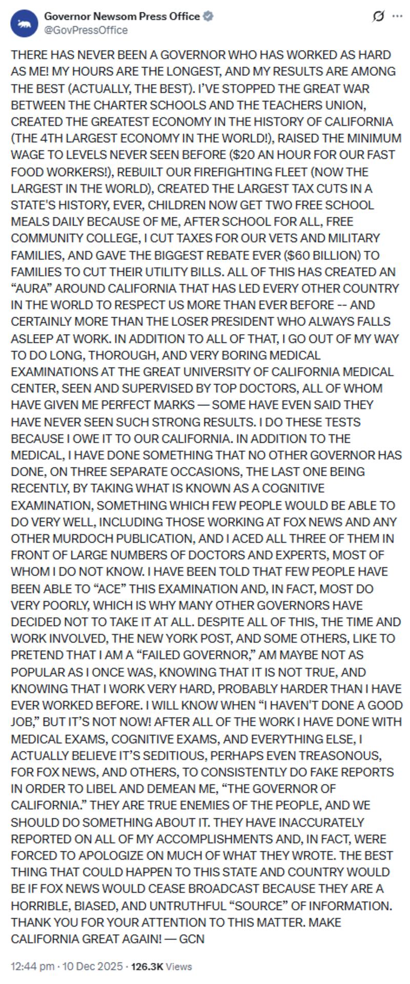 “There has never been a governor who has worked as hard as me! My hours are the longest, and my results are among the best (actually, the best),” Newsom’s press office wrote on X, before mentioning his accomplishments in California.