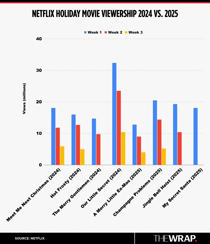 Netflix kicked off its 2025 holiday slate with the Alicia Silverstone and Oliver Hudson-led “A Merry Little Ex-Mas,” which debuted as the No. 2 most-watched English-language Netflix movie with 12.8 million views in its first five days during the week of Nov. 10, behind only “Frankenstein,” which debuted on Netflix just a week earlier. While “A Merry Little Ex-Mas” slipped down to 9 million views in its second week, Minka Kelly’s “Champagne Problems” picked up the baton as it debuted as the top movie during the week of Nov. 17 with 20.5 million views.