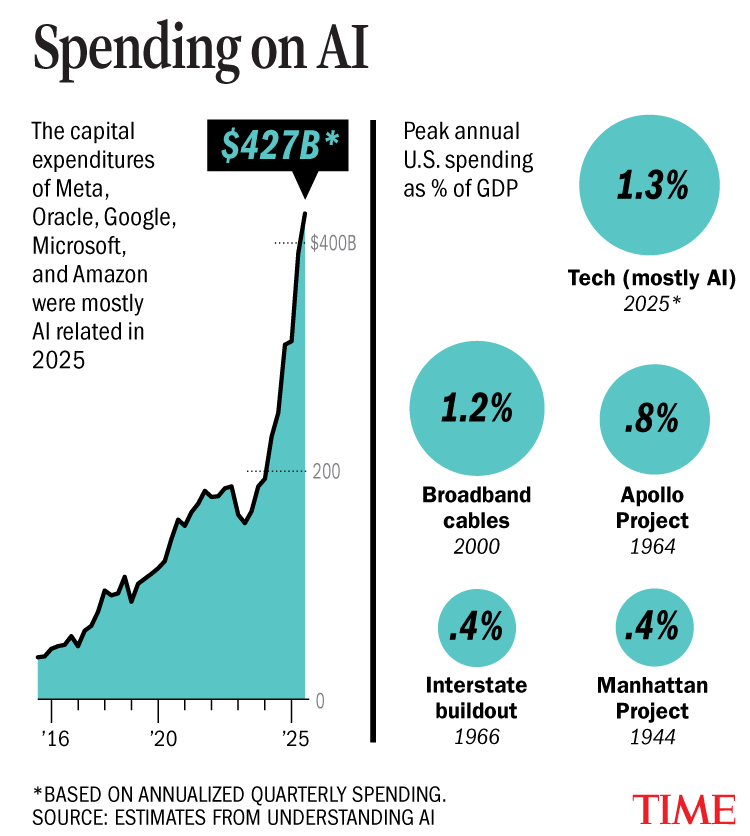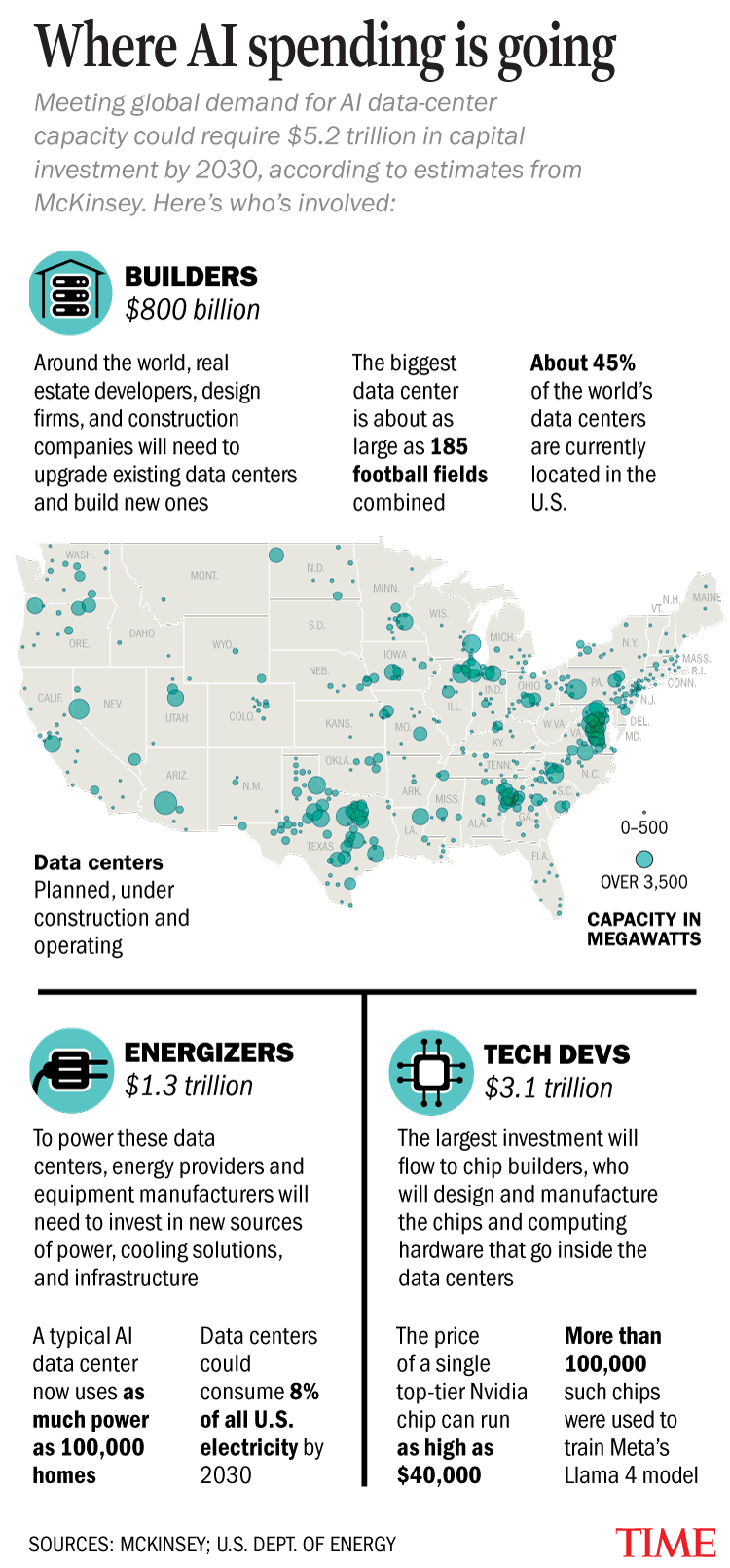 Data centers are expected to account for 8% of all U.S. power demand by 2030, up from 4% in 2023, according to Goldman Sachs. In 2025, they gravitated to where there was spare grid capacity: from the wind farms of West Texas, to the hydropower-rich Norwegian fjords north of the Arctic Circle, to the deserts of the Persian Gulf, which sit above vast deposits of crude oil. The top so-called hyperscalers—Amazon, Microsoft, Google, and Meta—announced plans to shell out a combined $370 billion this year to construct data centers and other AI infrastructure. (TIME has a content licensing partnership with Amazon.) The footprint of these facilities is staggering: Meta’s planned 5-GW data center in Richland Parish, Louisiana, known as Hyperion, will ultimately exceed the size and the energy demands of lower Manhattan. If not for this glut of construction, the U.S. economy might have fallen into a recession this year, some economists calculated.