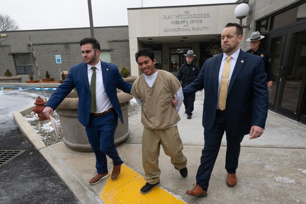 Santos Vasquez-Pamirrez, in an orange jumpsuit, is escorted by two men in suits from the Putnam County Sheriff's Office.